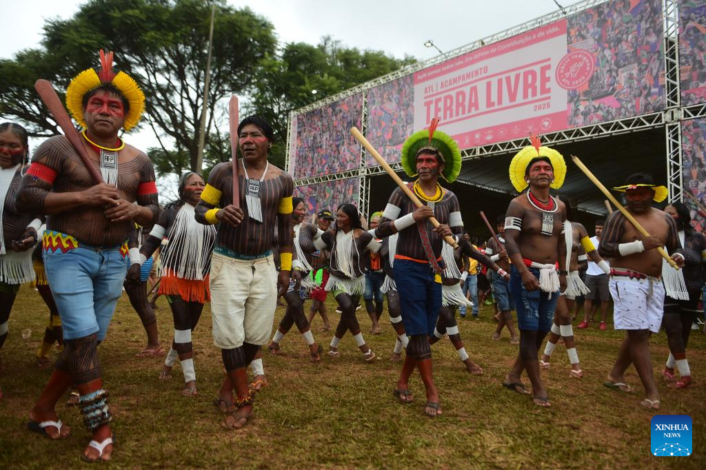 Personas indígenas participan en la apertura de la 21 edición del Campamento "Tierra Libre", en Brasilia, Brasil, el 7 de abril de 2025. (Xinhua/Lucio Tavora)