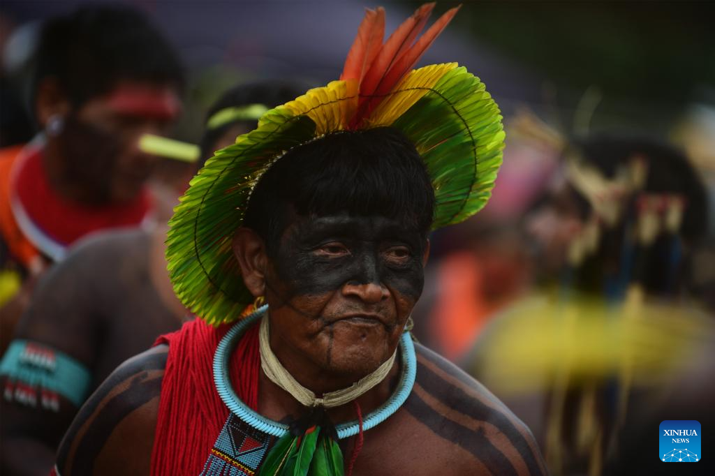 Un hombre indígena participa en la apertura de la 21 edición del Campamento "Tierra Libre", en Brasilia, Brasil, el 7 de abril de 2025. (Xinhua/Lucio Tavora)