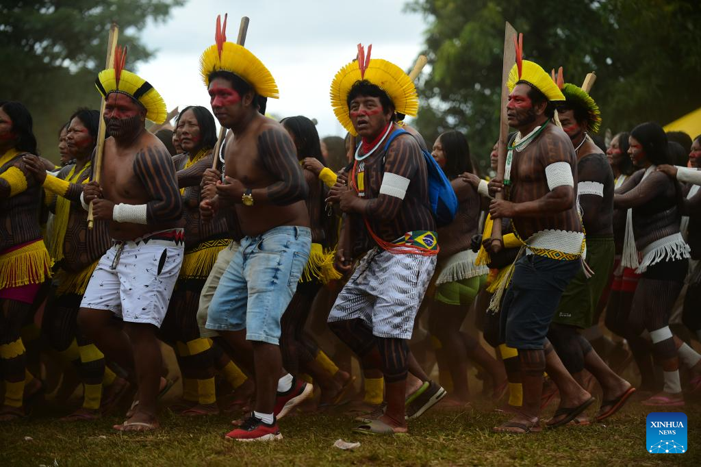 Personas indígenas participan en la apertura de la 21 edición del Campamento "Tierra Libre", en Brasilia, Brasil, el 7 de abril de 2025. (Xinhua/Lucio Tavora)