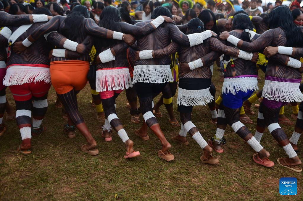 Personas indígenas participan en la apertura de la 21 edición del Campamento "Tierra Libre", en Brasilia, Brasil, el 7 de abril de 2025. (Xinhua/Lucio Tavora)