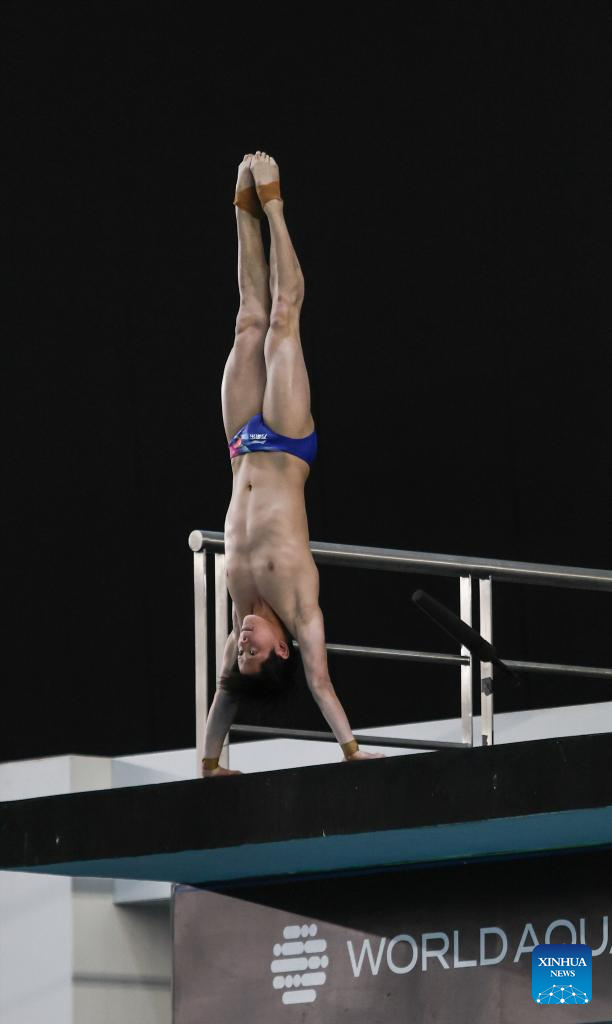 Imagen del 6 de abril de 2025 de Zhu Zifeng, de China, compitiendo durante la final de plataforma de 10 metros masculinos en la Copa Mundial de Clavados, en Guadalajara, estado de Jalisco, México. (Xinhua/Diana Márquez)