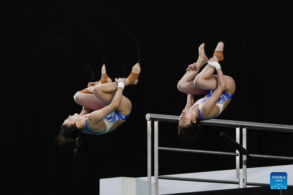 Imagen del 6 de abril de 2025 de Zhang Minjie (i)/Lu Wei, de China, compitiendo durante la final de plataforma de 10 metros sincronizados femeninos en la Copa Mundial de Clavados, en Guadalajara, estado de Jalisco, México. (Xinhua/Diana Márquez)