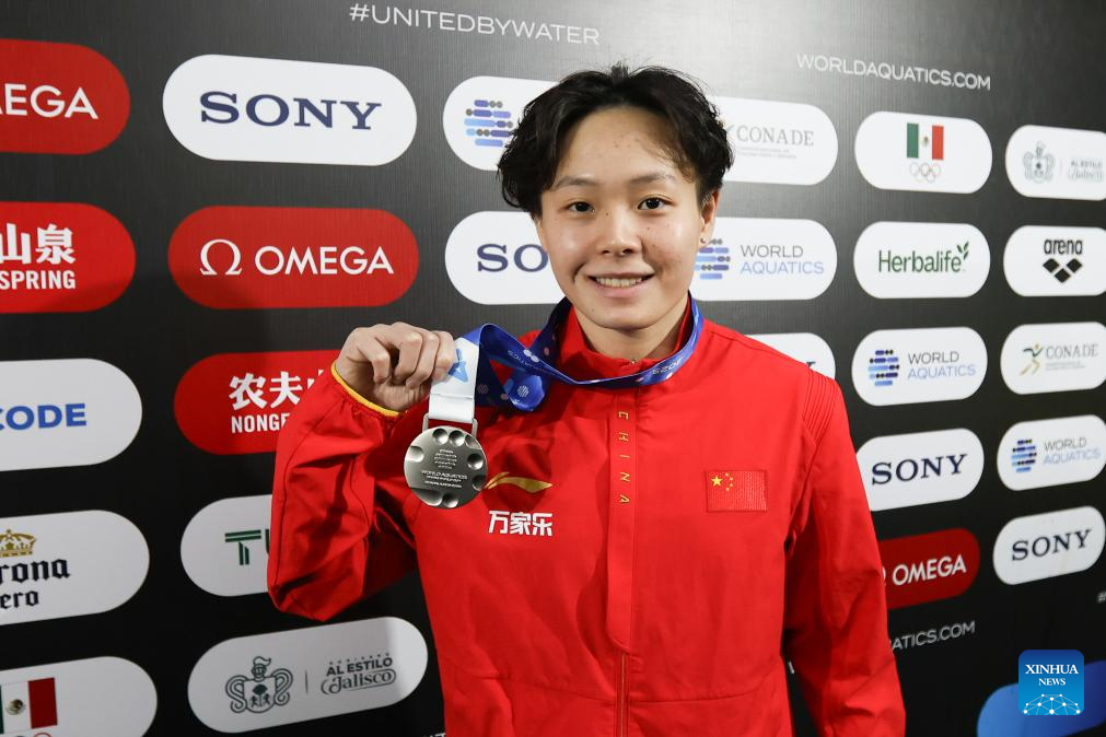 Imagen del 6 de abril de 2025 de la medallista de plata, Chen Yiwen, de China, posando al término de la ceremonia de premiación de la final de trampolín de 3 metros femeninos en la Copa Mundial de Clavados, en Guadalajara, estado de Jalisco, México. (Xinhua/Diana Márquez)