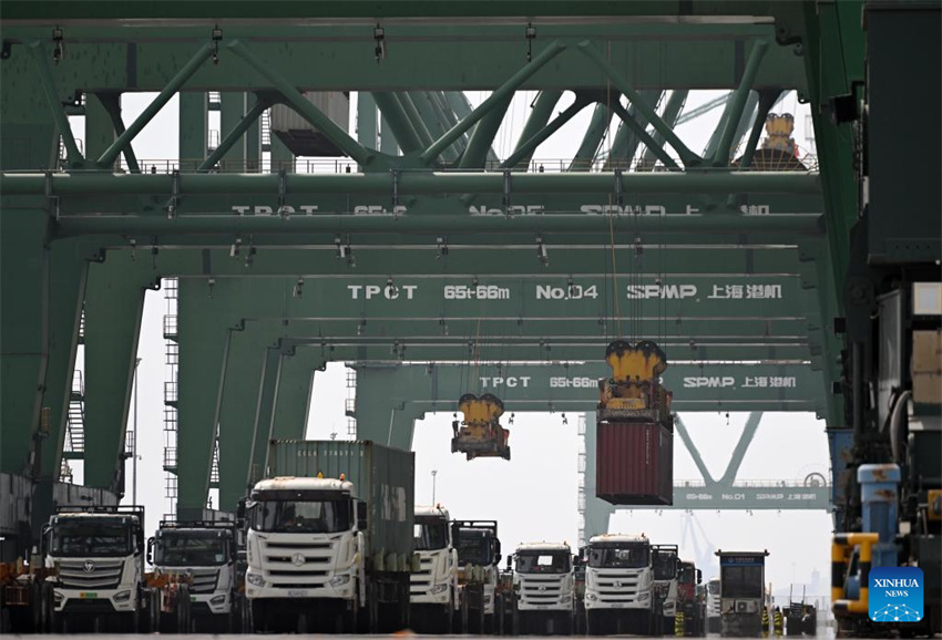 Camiones cargados de contenedores en una terminal de contenedores del puerto de Tianjin, en la ciudad septentrional china de Tianjin, el 8 de abril de 2025. (Xinhua/Zhao Zishuo.)