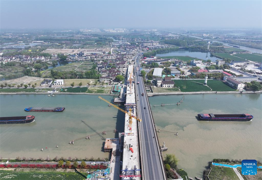 Una foto aérea tomada por un dron el 8 de abril de 2025 muestra las obras de construcción del puente Pingwang en Suzhou, provincia oriental china de Jiangsu.