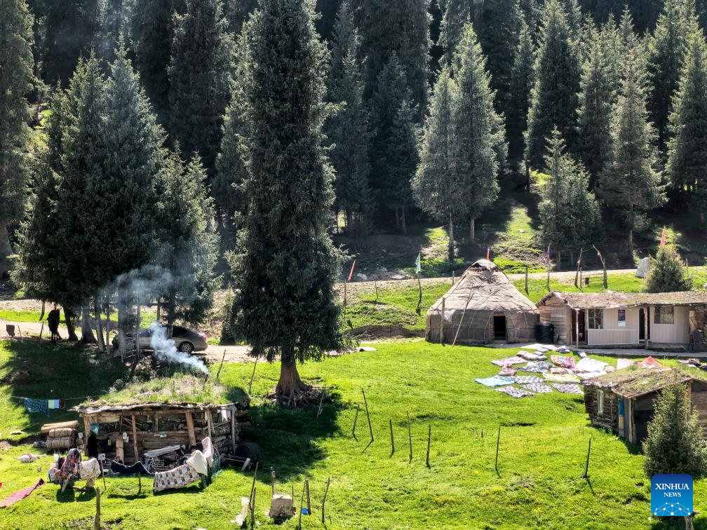 Una foto aérea tomada el 15 de mayo de 2024 muestra un pastizal en el distrito de Tekes, en la prefectura autónoma de la etnia kazaka de Ili, región autónoma uygur de Xinjiang, en el noroeste de China. (Fotografía de Zhang Qinghua/Xinhua.)