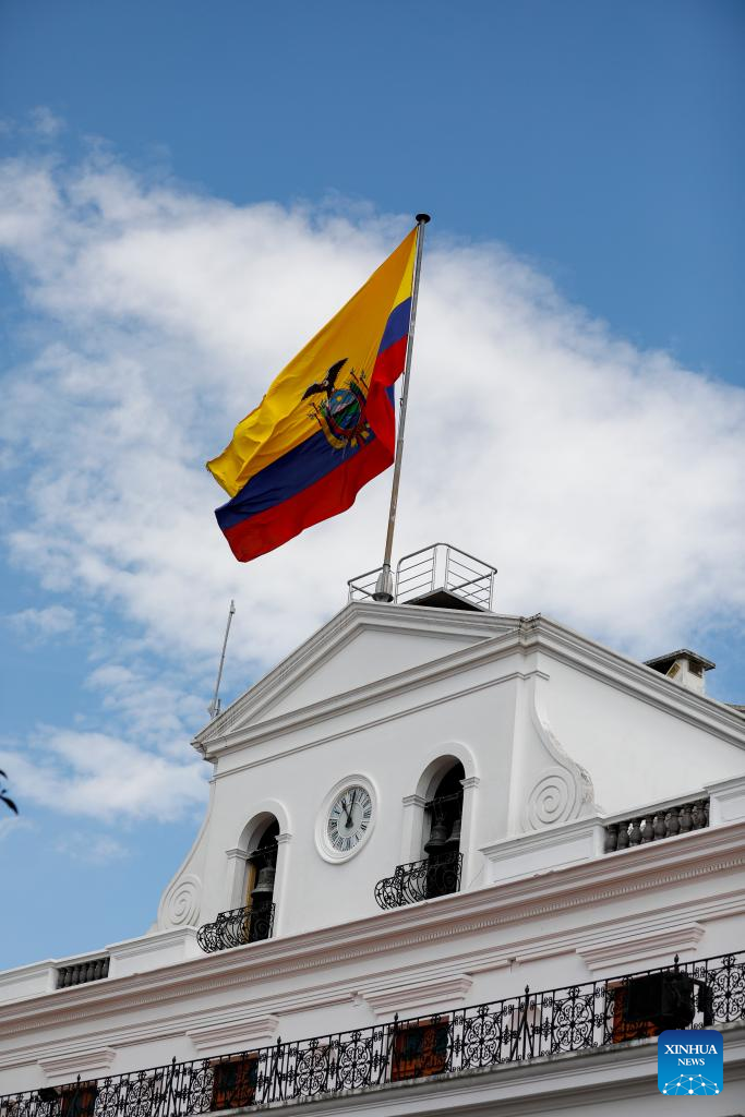 Una bandera nacional ecuatoriana ondea en el Palacio de Carondelet, en la ciudad de Quito, capital de Ecuador, el 14 de abril de 2025. El presidente de Ecuador, Daniel Noboa, fue reelegido en la segunda vuelta de las elecciones celebradas el domingo para un nuevo mandato de cuatro años, con el 92,64 por ciento de las actas escrutadas, según los primeros resultados oficiales difundidos por el Consejo Nacional Electoral (CNE). (Xinhua/Ricardo Landeta)