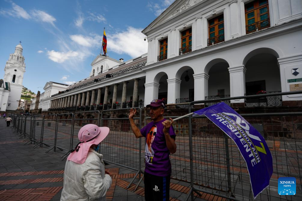 Un simpatizante del presidente ecuatoriano, Daniel Noboa, es visto frente al Palacio de Carondelet, en la ciudad de Quito, capital de Ecuador, el 14 de abril de 2025. Noboa fue reelegido en la segunda vuelta de las elecciones celebradas este domingo para un nuevo mandato de cuatro años, con el 92,64 por ciento de las actas escrutadas, según los primeros resultados oficiales difundidos por el Consejo Nacional Electoral (CNE). (Xinhua/Ricardo Landeta)