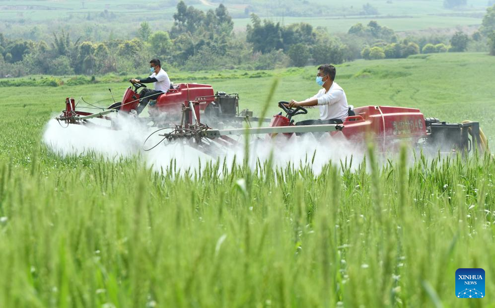 Imagen del 9 de abril de 2025 de personas conduciendo máquinas rociadoras en un campo, en el distrito de Shuangliu, en la ciudad de Chengdu, en la provincia de Sichuan, en el suroeste de China. (Xinhua/Li Xiangyu)