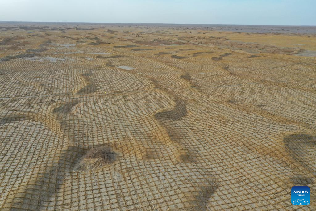 Vista aérea tomada con un dron el 8 de abril de 2025 de barreras de arena en forma de tablero de ajedrez, en el distrito de Minfeng de la prefectura de Hotan, en la región autónoma uygur de Xinjiang, en el noroeste de China. El desierto de Taklimakan, en la región autónoma uygur de Xinjiang, en el noroeste de China, cubre 337.600 kilómetros cuadrados y su circunferencia mide 3.046 kilómetros, lo que lo convierte en el desierto más grande de China y el segundo desierto flotante más grande del mundo. El Taklimakan está ahora completamente rodeado por un cinturón verde, gracias a más de cuatro décadas de esfuerzos como parte del Programa de la Franja Forestal Protectora de los Tres Nortes, el programa de forestación más grande del mundo para enfrentar la desertificación. (Xinhua/Ding Lei)