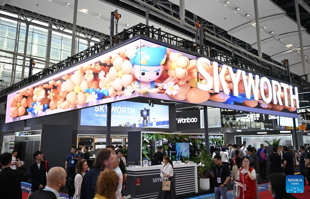 Imagen del 15 de abril de 2025 del estand de Skyworth Group de China visto en la zona de exposición de productos de vida inteligente durante la 137ª edición de la Feria de Importación y Exportación de China, en Guangzhou, en la provincia de Guangdong, en el sur de China. La 137ª edición de la Feria de Importación y Exportación de China, también conocida como la Feria de Cantón, se inauguró el martes, con el número de expositores de exportación superando los 30.000 por primera vez en la historia de este famoso evento. Productos que reflejan el concepto de innovación ecológica, incluidos dispositivos inteligentes de ahorro de energía y productos tecnológicos ecológicos, han ganado el favor de los comerciantes extranjeros durante la feria. (Xinhua/Deng Hua)