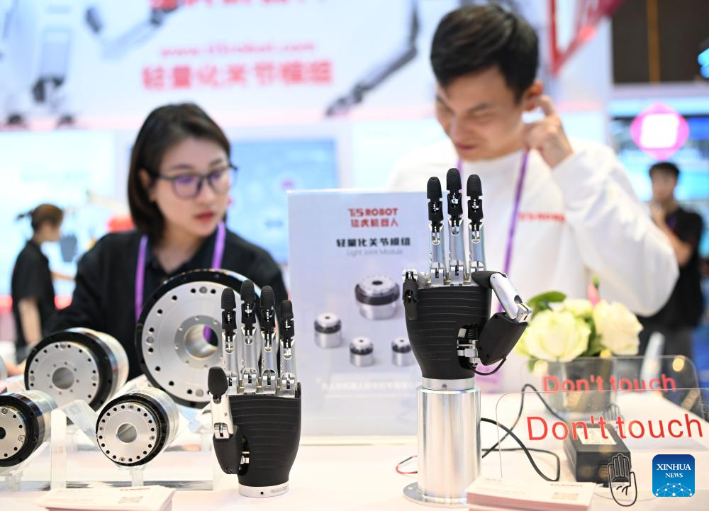 Esta foto tomada el 15 de abril de 2025 muestra las exhibiciones de manos robóticas en la Zona de Robots de Servicio durante la 137.ª edición de la Feria de Cantón. (Xinhua/Deng Hua.)