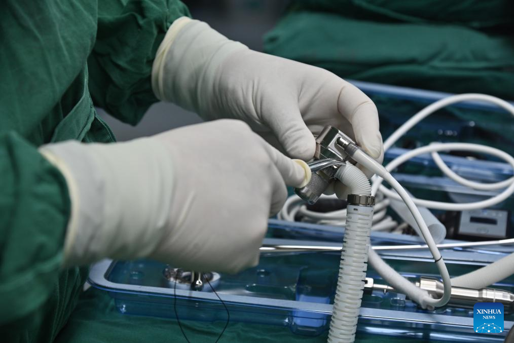 Un trabajador médico conecta venas artificiales con el dispositivo de asistencia biventricular elevado magnéticamente en Wuhan, provincia central china de Hubei, el 30 de marzo de 2025. (Foto de Zhao Jiong/Xinhua.)