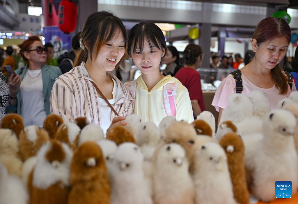 Visitantes seleccionan juguetes de peluche de alpaca australiana en la V Exposición Internacional de Productos de Consumo de China (CICPE, por sus siglas en inglés), en Haikou, en la provincia de Hainan, en el sur de China, el 17 de abril de 2025. La V CICPE abrió sus puertas al público en general el jueves, mostrando bienes y servicios de sectores como tecnología, cuidado de la salud, cultura, turismo y deportes. (Xinhua/Guo Cheng)