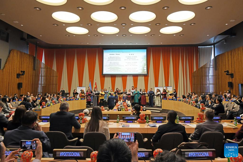 Imagen del 15 de abril de 2025 de cantantes de la Organización de las Naciones Unidas (ONU), que portan trajes tradicionales, interpretando la emblemática canción popular china "Jazmín" durante un evento conmemorativo del 16º Día del Idioma Chino de la ONU, en la sede de la ONU, en Nueva York. La ONU celebró su 16º Día del Idioma Chino el martes en su sede de Nueva York, ofreciendo una experiencia cultural inmersiva que fusionó la poesía y la música chinas. El evento de este año, "China Poética: Rimas y Romance", incluyó lecturas de poesía china, actuaciones musicales y una exposición sobre caracteres chinos. Más de 400 diplomáticos de la ONU, personal e invitados internacionales asistieron al evento. (Xinhua/Li Rui)