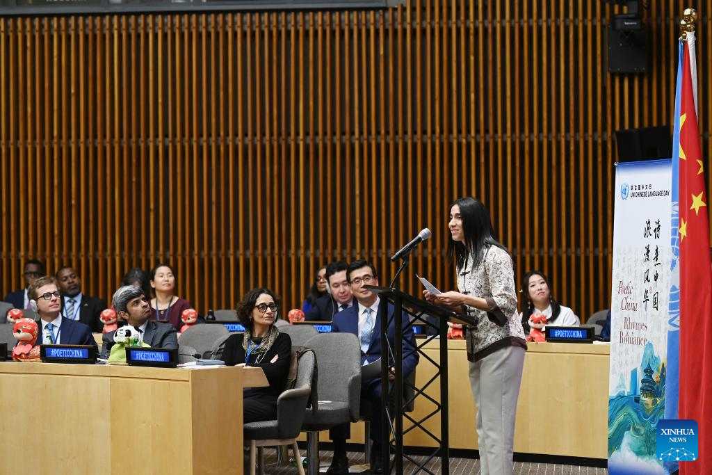 Imagen del 15 de abril de 2025 de una representante de la Misión Permanente de Italia ante las Naciones Unidas leyendo el poema "Una mañana de primavera" durante un evento conmemorativo del 16º Día del Idioma Chino de la Organización de las Naciones Unidas (ONU) , en la sede de la ONU, en Nueva York. La ONU celebró su 16º Día del Idioma Chino el martes en su sede de Nueva York, ofreciendo una experiencia cultural inmersiva que fusionó la poesía y la música chinas. El evento de este año, "China Poética: Rimas y Romance", incluyó lecturas de poesía china, actuaciones musicales y una exposición sobre caracteres chinos. Más de 400 diplomáticos de la ONU, personal e invitados internacionales asistieron al evento. (Xinhua/Li Rui)