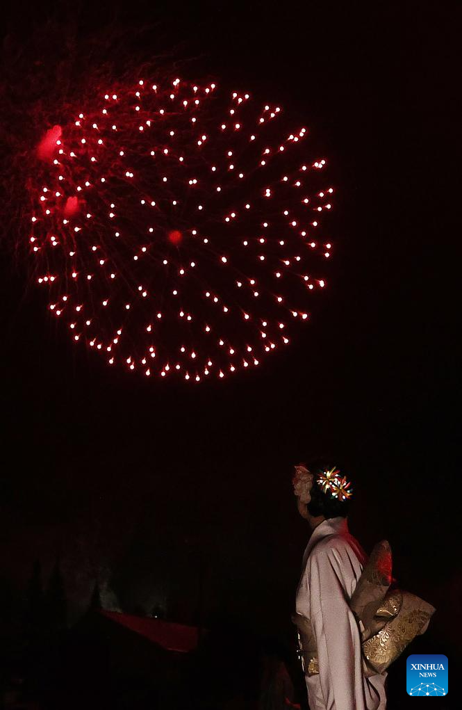 Una mujer observa fuegos artificiales durante un espectáculo de fuegos artificiales llevado a cabo al pie del Monte Fuji, en Yamanashi, Japón, el 19 de abril de 2025. (Xinhua/Jia Haocheng)