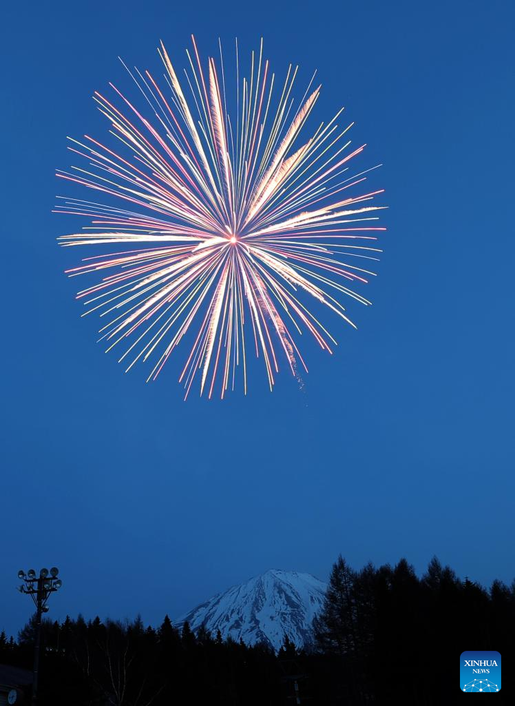 Fuegos artificiales iluminan el cielo durante un espectáculo de fuegos artificiales llevado a cabo al pie del Monte Fuji, en Yamanashi, Japón, el 19 de abril de 2025. (Xinhua/Jia Haocheng)