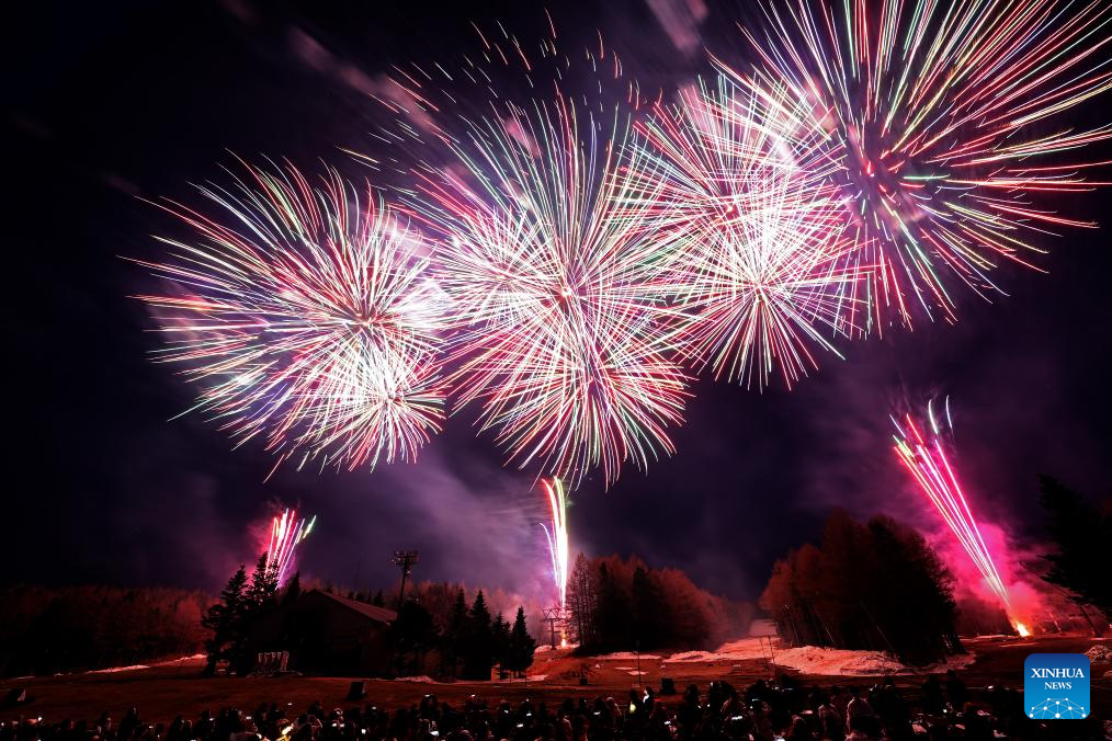 Personas observan fuegos artificiales durante un espectáculo de fuegos artificiales llevado a cabo al pie del Monte Fuji, en Yamanashi, Japón, el 19 de abril de 2025. (Xinhua/Jia Haocheng)