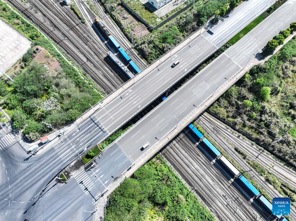 Vista aérea tomada con un dron el 20 de abril de 2025 de un tren de carga China-Asia Central saliendo desde la estación de Tuanjiecun, en Chongqing, en el suroeste de China. Un tren de carga, cargado con virutas de poliéster fabricadas en Chongqing, en el suroeste de China, partió de la municipalidad el domingo por la mañana con destino a Uzbekistán, marcando la inauguración de una nueva ruta regular de trenes de carga desde Chongqing hacia los países de Asia Central. Se espera que el tren llegue a la capital uzbeka, a unos 4.700 kilómetros de distancia, en unos 12 días. Saldrá de China por el puerto de Horgos en Xinjiang y pasará por Kazajistán. Estos servicios regulares podrían garantizar un despacho de aduanas rápido, un traslado puntual y costos reducidos, garantizando así un transporte transfronterizo de mejor calidad. (Xinhua/Tang Yi)
