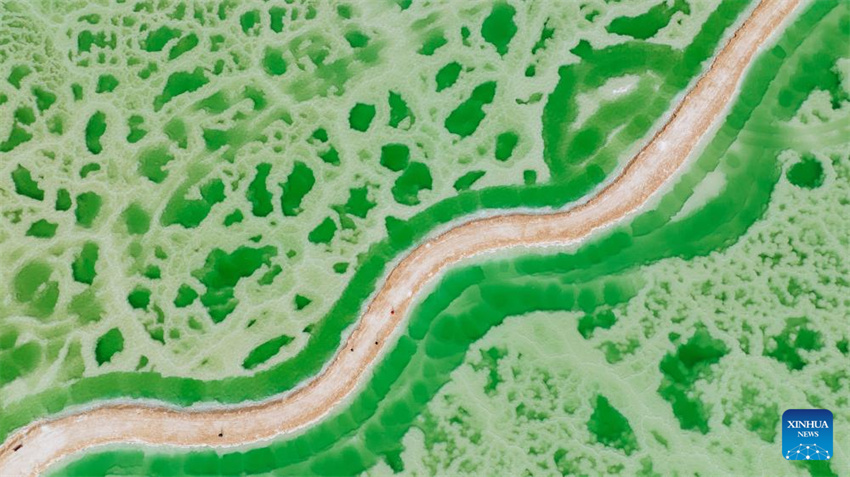 Una foto aérea tomada con un dron el 19 de abril de 2025 muestra el Lago de Jade en Mangya, prefectura autónoma de las etnias mongola y tibetana de Haixi, en la provincia noroccidental china de Qinghai. (Xinhua/Du Xiaowei.)