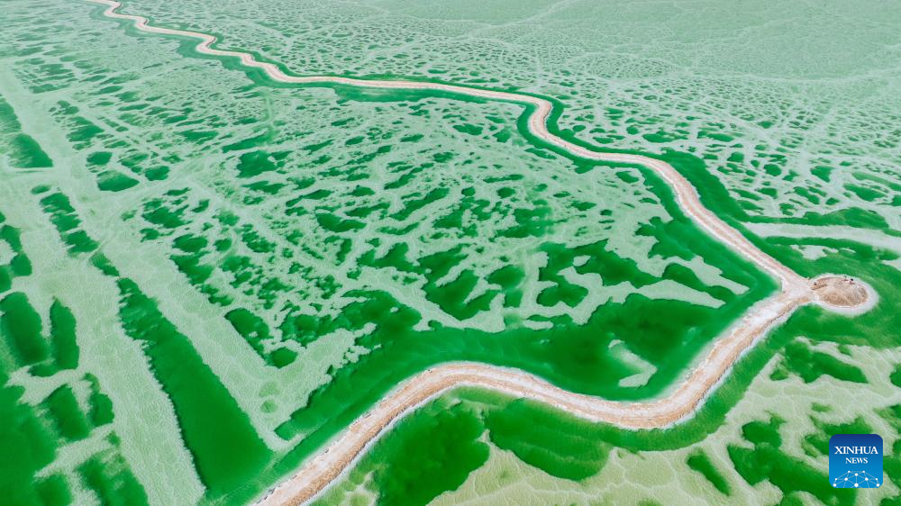 Vista aérea tomada con un dron el 19 de abril de 2025 del Lago de Jade, en Mangya, en la prefectura autónoma mongola y tibetana de Haixi, en la provincia de Qinghai, en el noroeste de China. Debido a la diferencia en su profundidad y a la concentración de minerales en el agua, el Lago de Jade adquiere diversas tonalidades, lo que lo convierte en un popular punto escénico. (Xinhua/Du Xiaowei)