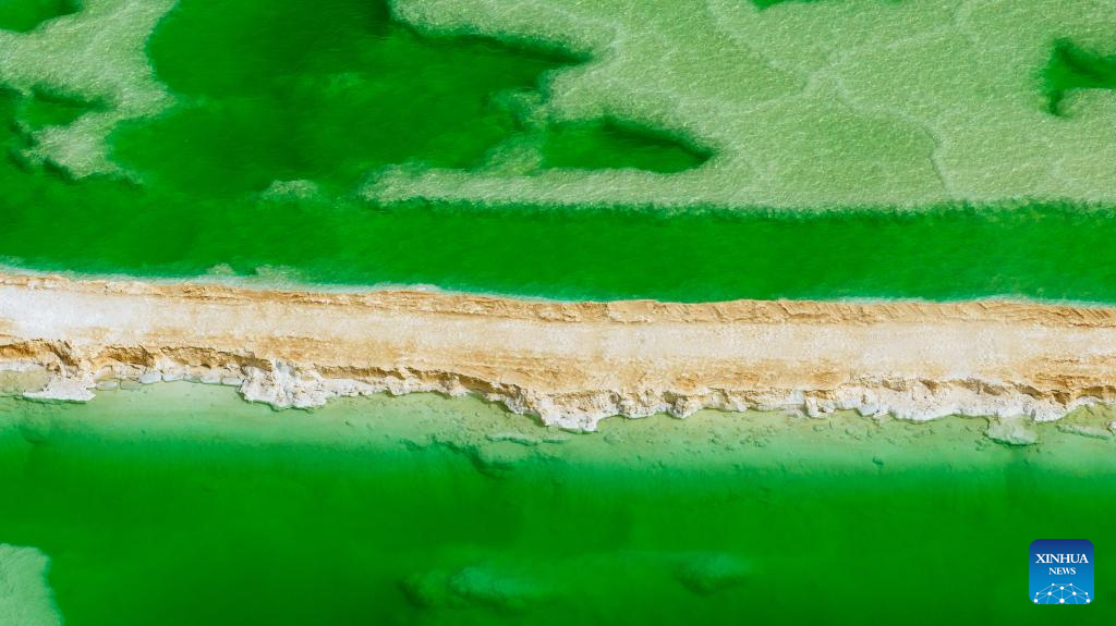 Vista aérea tomada con un dron el 19 de abril de 2025 del Lago de Jade, en Mangya, en la prefectura autónoma mongola y tibetana de Haixi, en la provincia de Qinghai, en el noroeste de China. Debido a la diferencia en su profundidad y a la concentración de minerales en el agua, el Lago de Jade adquiere diversas tonalidades, lo que lo convierte en un popular punto escénico. (Xinhua/Wang Bo)
