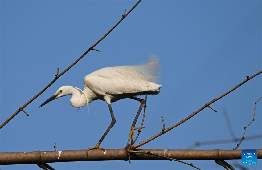 Una garceta camina sobre una rama de bambú en el municipio de Zhuxi, distrito de Dazu, municipalidad de Chongqing, suroeste de China, el 21 de abril de 2025. (Xinhua/Chen Cheng.)
