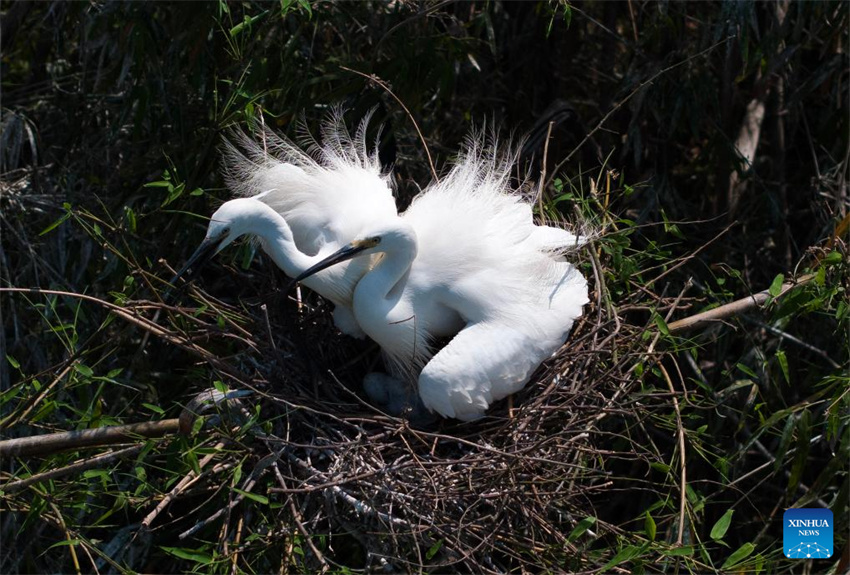 Dos garcetas cuidan de sus polluelos recién nacidos en el municipio de Zhuxi, distrito de Dazu, en la municipalidad de Chongqing, suroeste de China, el 20 de abril de 2025. (Xinhua/Chen Cheng.)