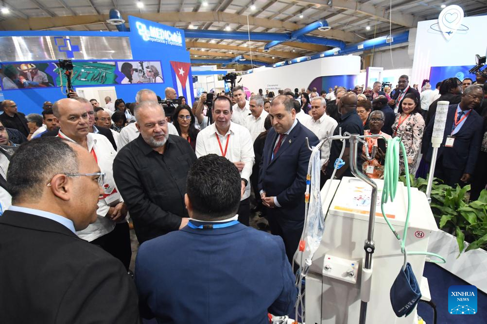 Imagen del 21 de abril de 2025 del primer ministro cubano, Manuel Marrero Cruz (2-i-c), y el ministro de Salud Pública de Cuba, José Angel Portal Miranda (2-d-c), asistiendo a la XVI Feria Comercial Salud para Todos, que forma parte de la V Convención Internacional "Cuba Salud 2025", en el recinto ferial de Pabexpo, en La Habana, capital de Cuba. Cuba busca expandir la cooperación con China en materia biotecnológica, aseguró la presidenta del estatal grupo empresarial BioCubaFarma, Mayda Mauri. (Xinhua/Joaquín Hernández)