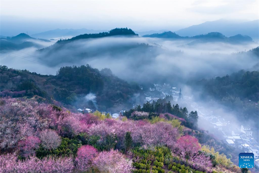 Una foto aérea tomada por un dron el 16 de febrero de 2025 muestra los ciruelos en flor en la aldea de Maihuayu del distrito de Shexian, ciudad de Huangshan, provincia oriental china de Anhui. (Foto de Fan Chengzhu/Xinhua.)