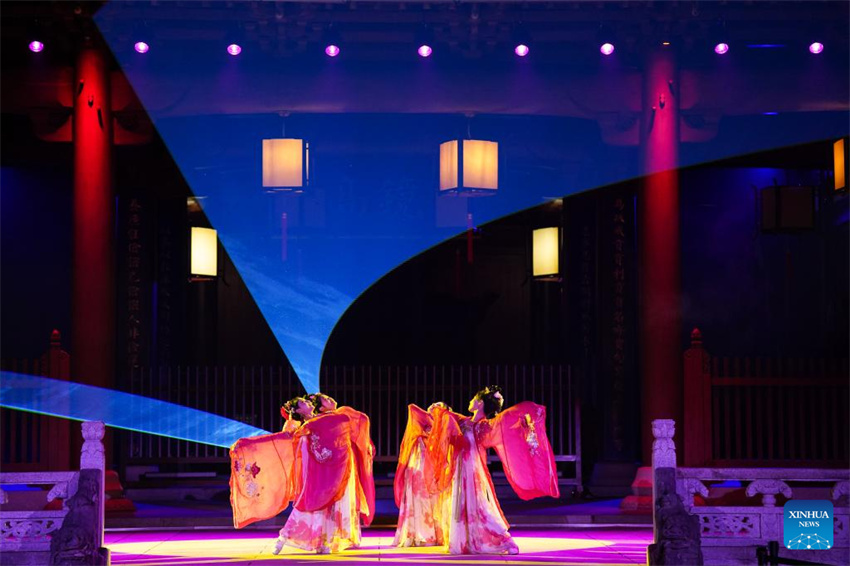 Actrices actúan en la antigua ciudad de Huizhou, en el distrito de Shexian de la ciudad de Huangshan, provincia oriental china de Anhui, el 10 de enero de 2024. (Xinhua/Du Yu.)