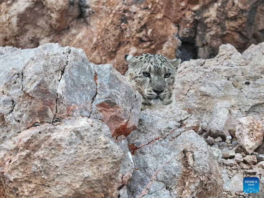 Un leopardo de las nieves fotografiado en el distrito de Gerze, en la prefectura de Ngari, en la región autónoma de Xizang, suroeste de China, el 18 de abril de 2025. (Foto de Sonam Rinchen/Xinhua.)