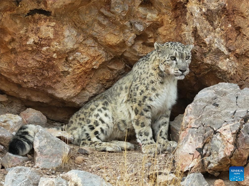 Un leopardo de las nieves fotografiado en el distrito de Gerze, en la prefectura de Ngari, en la región autónoma de Xizang, suroeste de China, el 18 de abril de 2025. (Foto de Sonam Rinchen/Xinhua.)