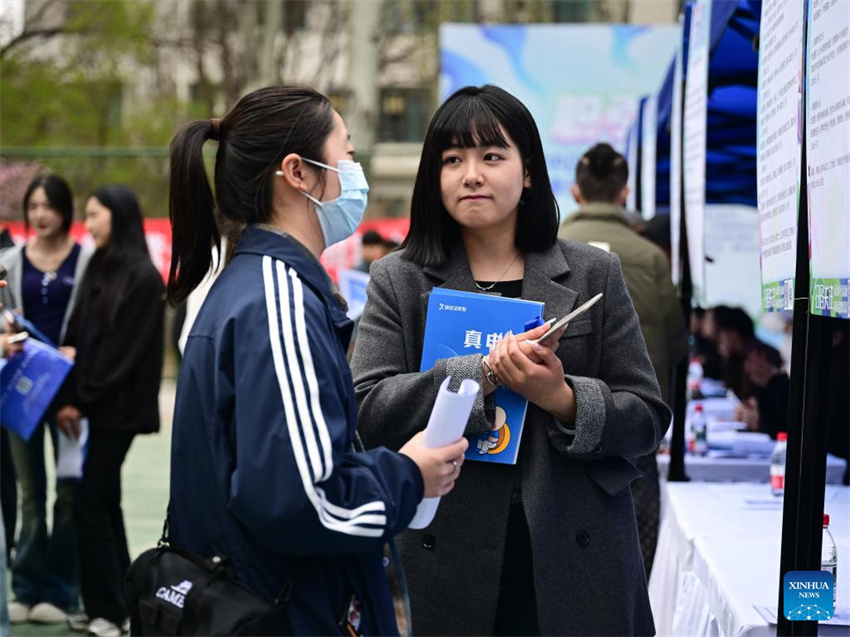 Una estudiante (izq.) conversa con una empleadora durante una feria de empleo en el campus de la Facultad de Tecnología Arquitectónica de Qinghai, en Xining, provincia de Qinghai, noroeste de China, el 23 de abril de 2025. (Xinhua/Zhang Long.)