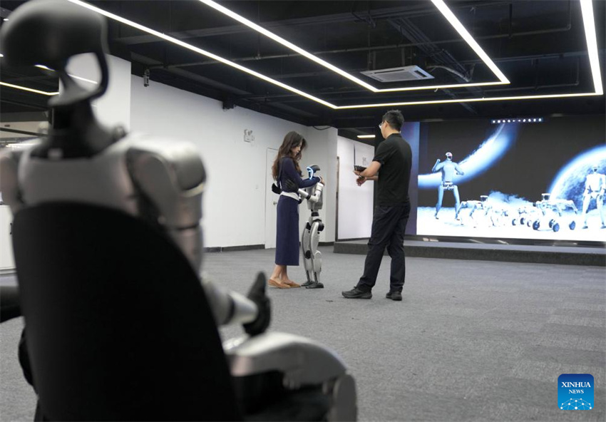 Un robot humanoide Unitree G1 realiza un gesto de abrazo en una sala de exposiciones de Unitree Robotics en Hangzhou, provincia de Zhejiang, este de China, el 23 de abril de 2025. (Xinhua/Han Chuanhao.)