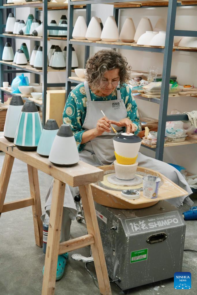 La ceramista alemana Karin Flurer-Bruenger trabaja en su estudio de la Avenida de Arte Cerámico Taoxichuan, en Jingdezhen, provincia oriental china de Jiangxi, el 8 de abril de 2025. (Xinhua/Du Juanjuan.)