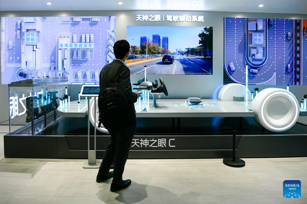 Un visitante aprende sobre un sistema de asistencia de conducción de BYD en la XXI Exposición Internacional de la Industria Automotriz de Shanghai, en Shanghai, en el este de China, el 25 de abril de 2025. Con el tema "Abrazando la Innovación, Empoderando el Futuro", la exposición, también conocida como Auto Shanghai 2025, comenzó aquí el miércoles, atrayendo a casi 1.000 empresas destacadas de 26 países y regiones. Además del debut de nuevos modelos, los fabricantes de automóviles también aprovecharon el escenario con sus últimas tecnologías para vehículos inteligentes, como la conducción inteligente, sistemas de inteligencia artificial (IA) y cabinas inteligentes. (Xinhua/Wang Xiang)