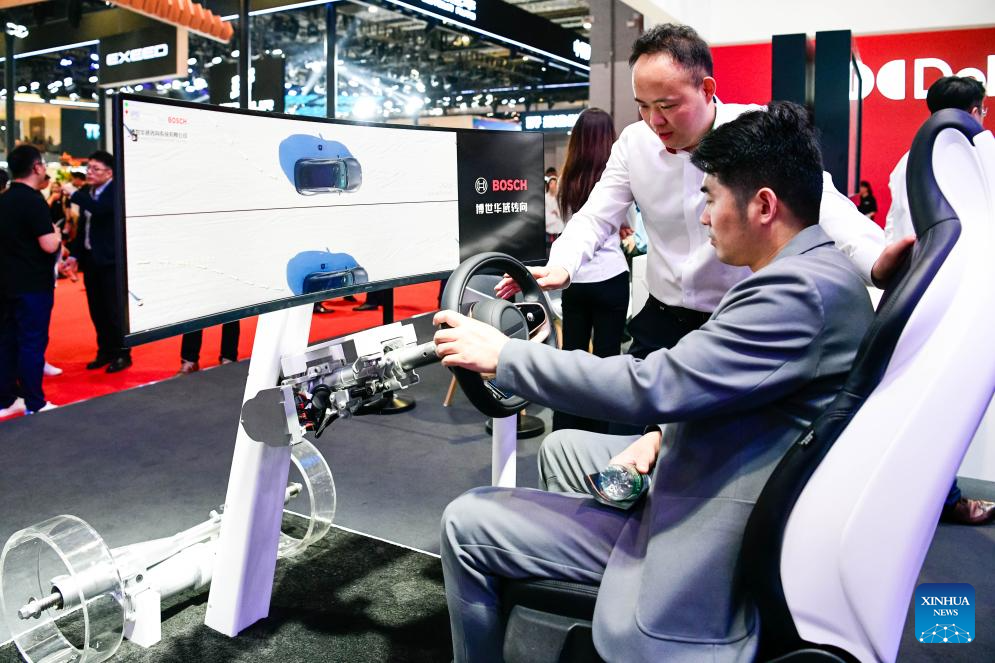 Un visitante prueba una solución de un sistema de dirección de Bosch Huayu en la XXI Exposición Internacional de la Industria Automotriz de Shanghai, en Shanghai, en el este de China, el 25 de abril de 2025. Con el tema "Abrazando la Innovación, Empoderando el Futuro", la exposición, también conocida como Auto Shanghai 2025, comenzó aquí el miércoles, atrayendo a casi 1.000 empresas destacadas de 26 países y regiones. Además del debut de nuevos modelos, los fabricantes de automóviles también aprovecharon el escenario con sus últimas tecnologías para vehículos inteligentes, como la conducción inteligente, sistemas de inteligencia artificial (IA) y cabinas inteligentes. (Xinhua/Wang Xiang)