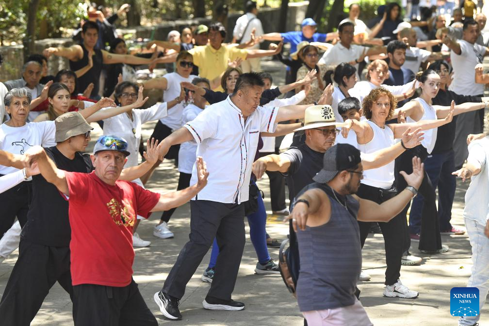 Shi Yuewen (c), director del Centro Cultural de China en México, participa en la clase "Unete al Movimiento: Tai Chi Contigo Día Mundial del Tai Chi 2025" convocada por el Centro Cultural de China en México en el marco del Día Internacional del Tai Chi en el Zoológico de Chapultepec, en la Ciudad de México, capital de México, el 27 de abril de 2025. (Xinhua/Octavio Gómez)