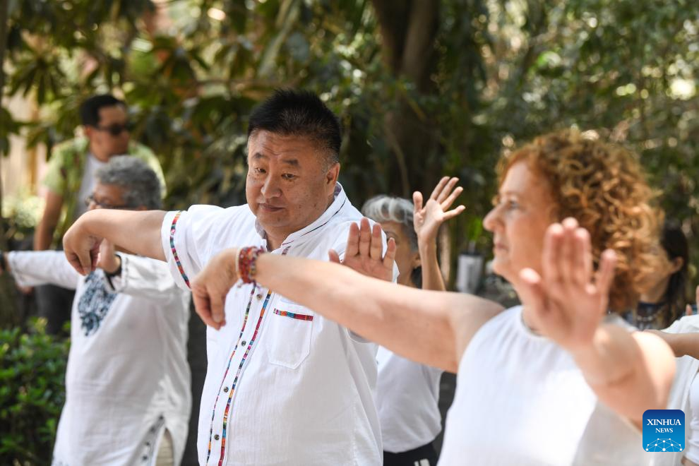 Shi Yuewen (i), director del Centro Cultural de China en México, participa en la clase "Unete al Movimiento: Tai Chi Contigo Día Mundial del Tai Chi 2025" convocada por el Centro Cultural de China en México en el marco del Día Internacional del Tai Chi en el Zoológico de Chapultepec, en la Ciudad de México, capital de México, el 27 de abril de 2025. (Xinhua/Octavio Gómez)