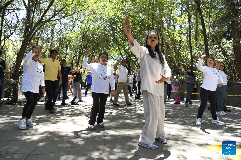 Miriam Gloria H. (frente), instructora de Tai Chi, participa en la clase"Unete al Movimiento: Tai Chi Contigo Día Mundial del Tai Chi 2025" convocada por el Centro Cultural de China en México en el marco del Día Internacional del Tai Chi en el Zoológico de Chapultepec, en la Ciudad de México, capital de México, el 27 de abril de 2025. (Xinhua/Octavio Gómez)