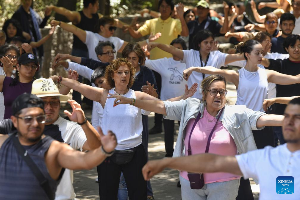 Personas participan en la clase "Unete al Movimiento: Tai Chi Contigo Día Mundial del Tai Chi 2025" convocada por el Centro Cultural de China en México en el marco del Día Internacional del Tai Chi en el Zoológico de Chapultepec, en la Ciudad de México, capital de México, el 27 de abril de 2025. (Xinhua/Octavio Gómez)