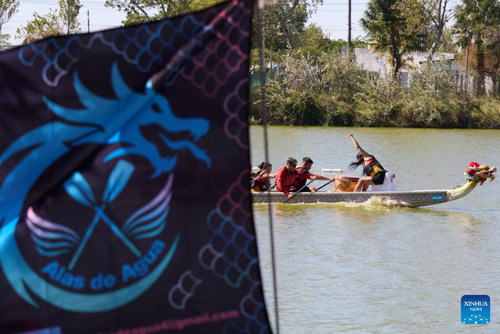 Imagen del 26 de abril de 2025 de personas participando en una competencia de Botes del Dragón, en Avellaneda, Argentina. (Xinhua/Meng Dingbo)