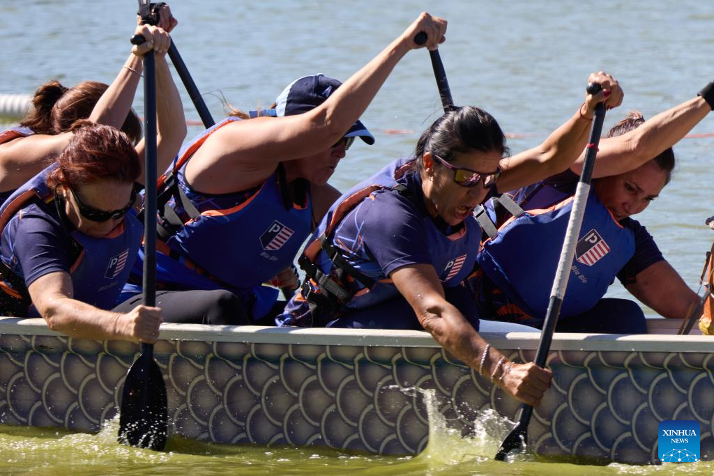 Imagen del 26 de abril de 2025 de personas participando en una competencia de Botes del Dragón, en Avellaneda, Argentina. (Xinhua/Meng Dingbo)