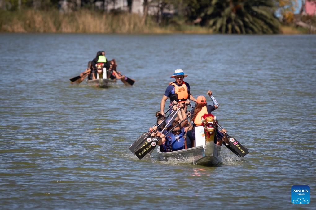 Imagen del 26 de abril de 2025 de personas participando en una competencia de Botes del Dragón, en Avellaneda, Argentina. (Xinhua/Martín Zabala)