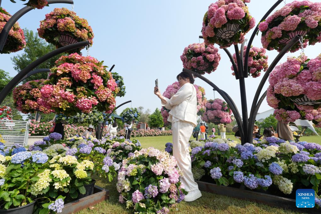 Una visitante toma fotos en la Exposición Mundial de Jardines 2025 en la ciudad de Haining, provincia oriental china de Zhejiang, 28 de abril de 2025. El evento arrancó el lunes con una superficie de 500 000 metros cuadrados. (Xinhua/Weng Xinyang)
