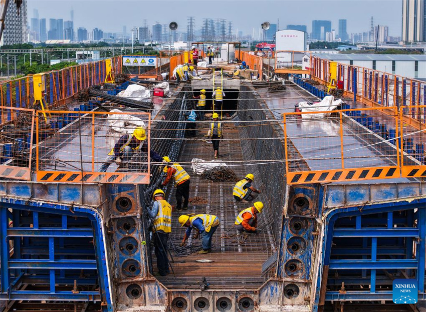 El trabajo no para en la línea de enlace entre estaciones de tren en Guangzhou