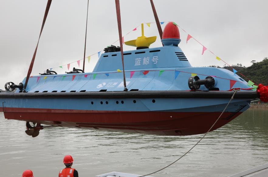 Presentación de la «Ballena azul», un sumergible de alta velocidad no tripulado, en Zhuhai, en la provincia sureña china de Guangdong, 28 de abril de 2025. La nave marca un gran avance en tecnología marina del país y en el desarrollo de equipos oceánicos inteligentes. (Xinhua)