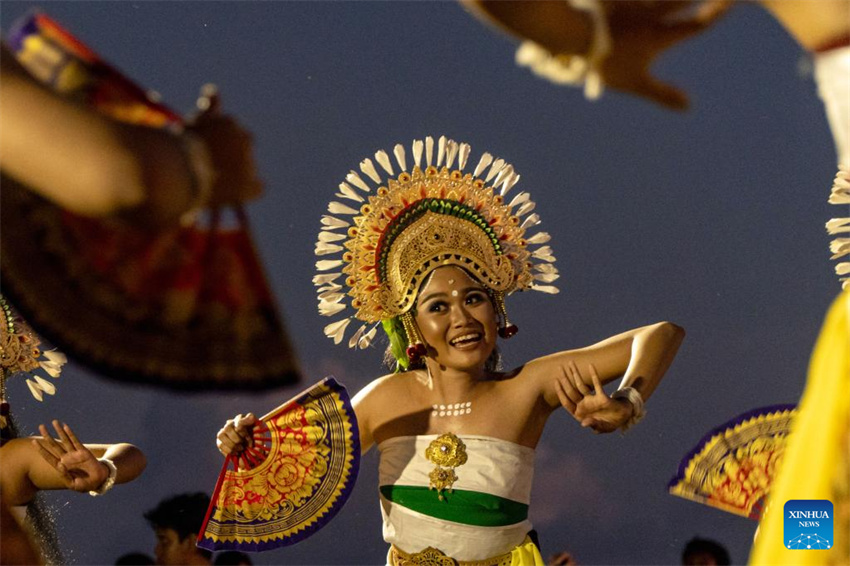 Una artista interpreta la danza tradicional balinesa Janger para celebrar el Día Internacional de la Danza en la playa de Pererenan, en la regencia de Badung, Bali, Indonesia, el 29 de abril de 2025. (Foto de Dicky Bisinglasi/Xinhua.)